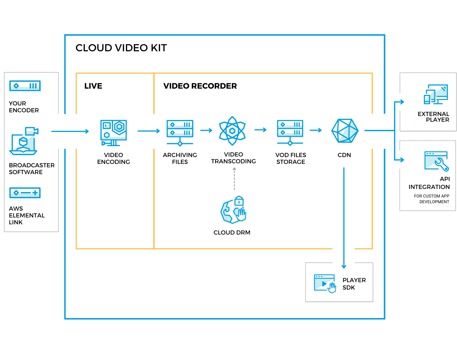 Should your live content generate value only during its initial broadcast? We believe not. Cloud Video Kit lets you easily record your live streams, store them in a cloud, and download whenever you need.