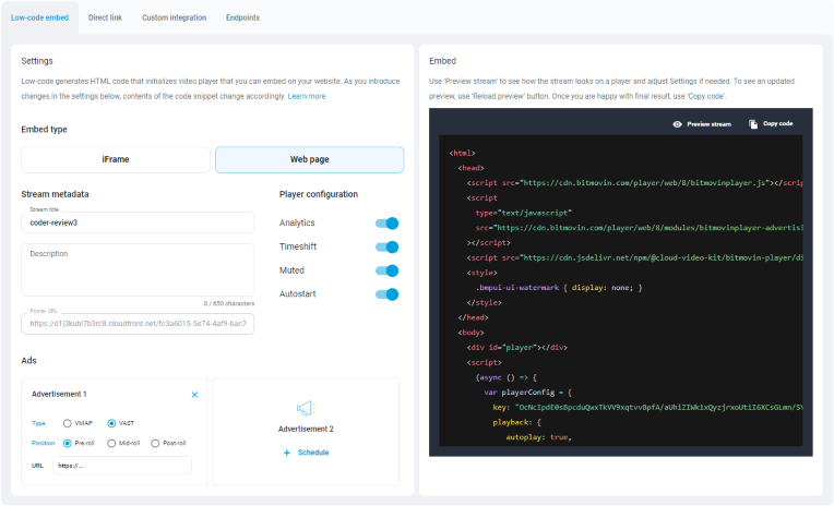 Your videos are streaming-ready - time to show them to your viewers. Low-code embedded player, direct link, custom integration… Whatever scenario you have in mind, we’ve got you covered.
